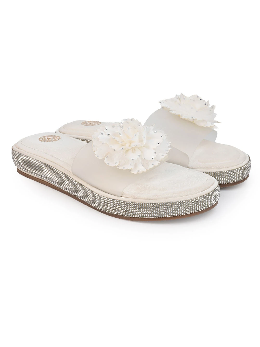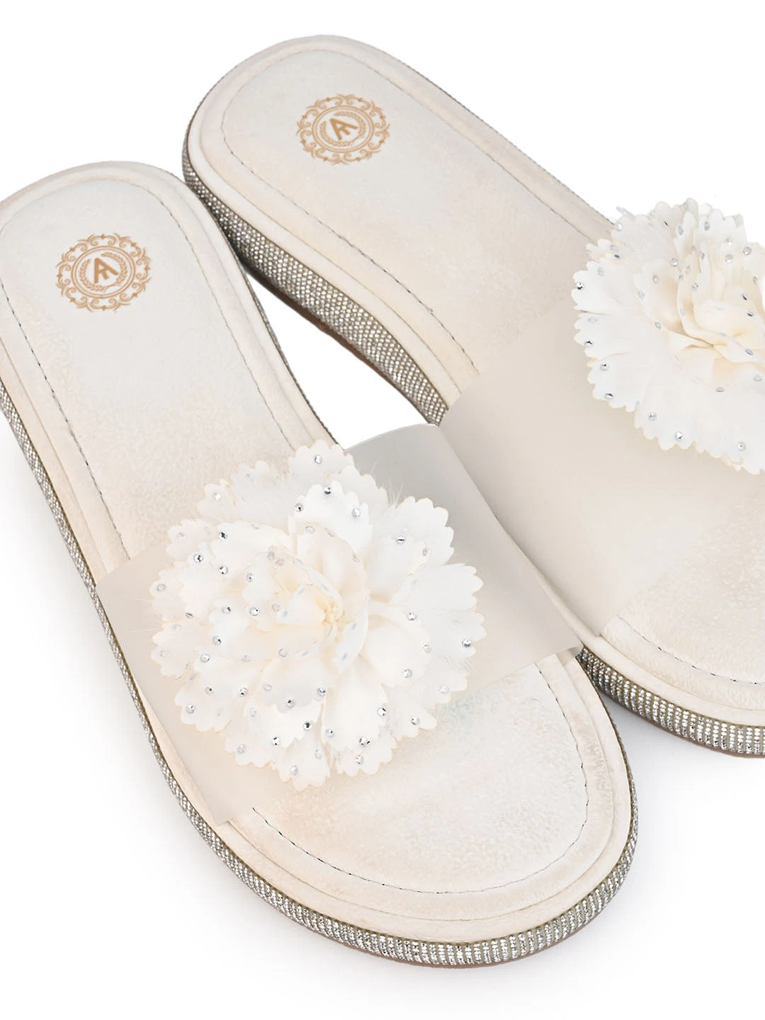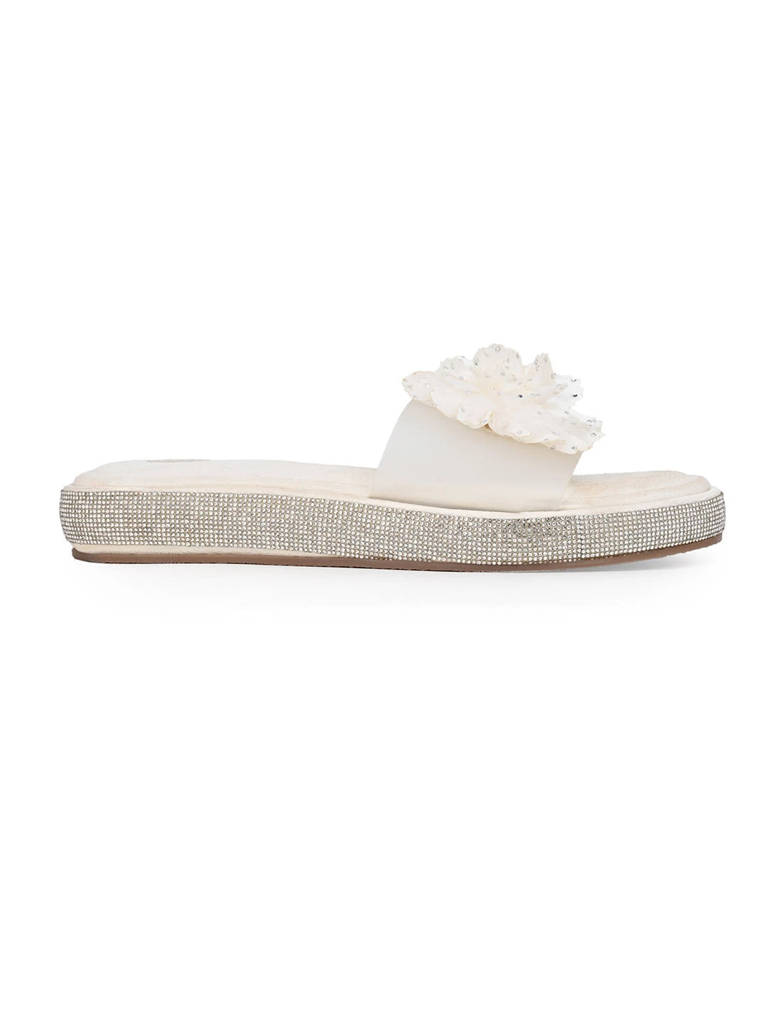 Step into effortless elegance with Alberto Torresi’s white floral slide sandals, designed to add charm and sophistication to your wardrobe. The highlight of this pair is the beautiful 3D flower embellishment, delicately accented with crystal studs for a sparkling finish.