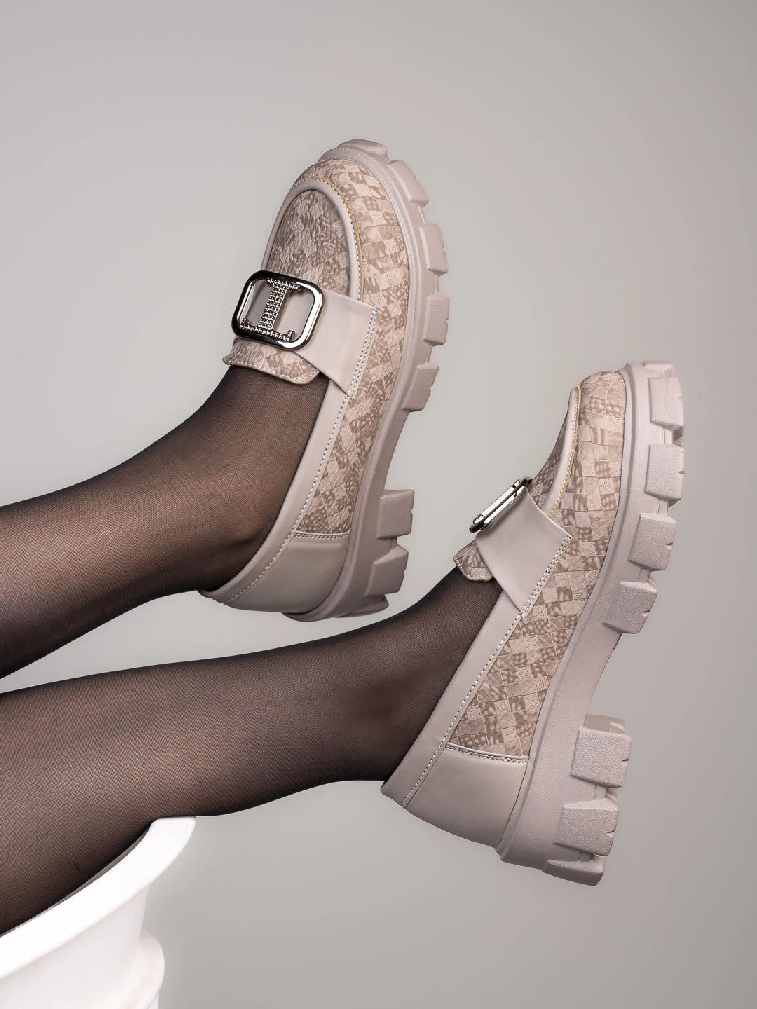 Bring bold style and comfort together with these statement loafers from Alberto Torresi. Crafted with a modern textured upper in a neutral beige tone, these loafers feature a striking metallic buckle that adds a sophisticated edge. The chunky lug sole not only enhances durability but also provides all-day comfort with a trendy street-style vibe.